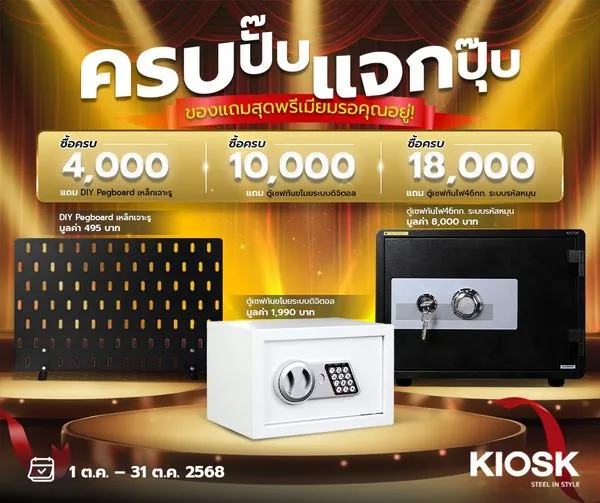 Shop KIOSK products and get a free DIY Pegboard, anti-theft safe, or fireproof safe when you spend 4,000, 10,000, or 18,000 THB.
